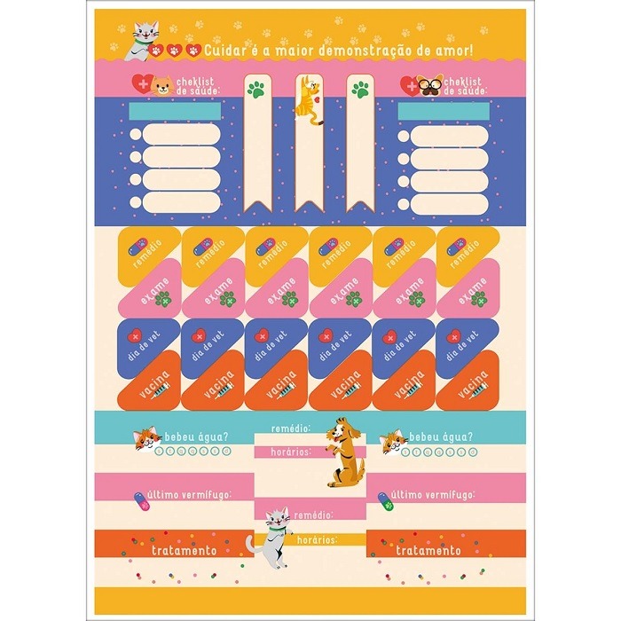 As Folhas de Adesivos Pets tornam as anotações da rotina do seu pet muito mais organizadas e divertidas. Este produto contém mais de 60 adesivos de diferentes cores e tamanhos, divididos em 6 cartelas com formato 152 mm x 211 mm.