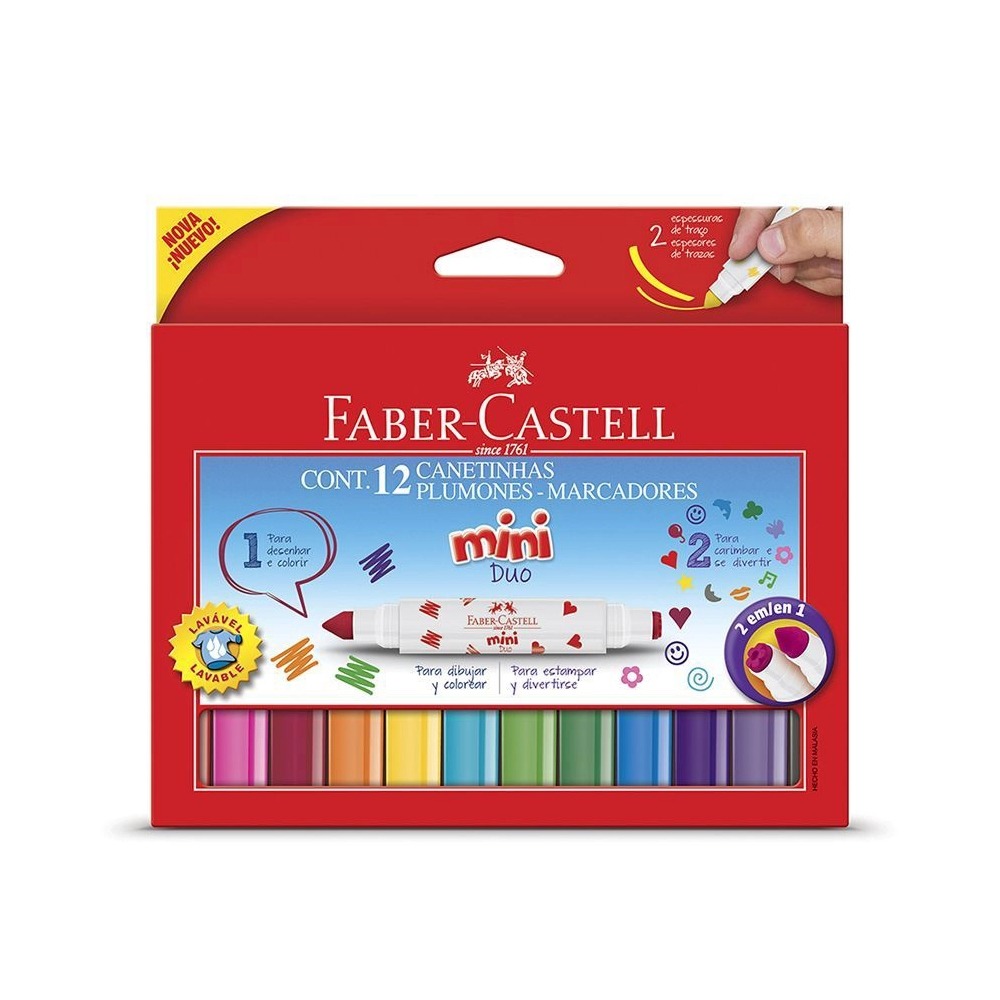 Caneta Hidrografica Faber Castell 12 Cores Duo Mini Com Carimbo Duo