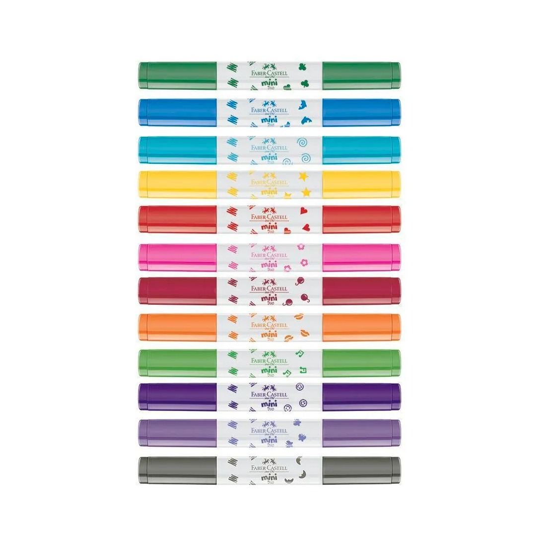 A Caneta Hidrográfica Faber-Castell 12 Cores Duo Mini com Carimbo Duo é um conjunto compacto e versátil, especialmente projetado para crianças. Cada caneta possui duas cores e um carimbo na tampa, oferecendo diversão e criatividade adicionais durante o uso. Ideal para desenhos, colorações e atividades escolares, proporcionando cores vibrantes e facilidade de uso com seu formato mini.