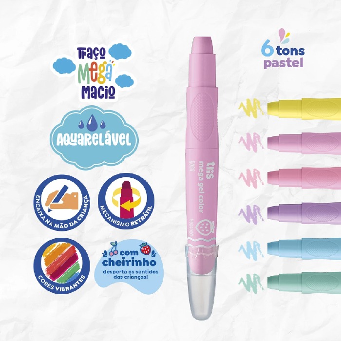 Giz De Cera Tris Mega Gel Pastel Retrátil 06 Cores