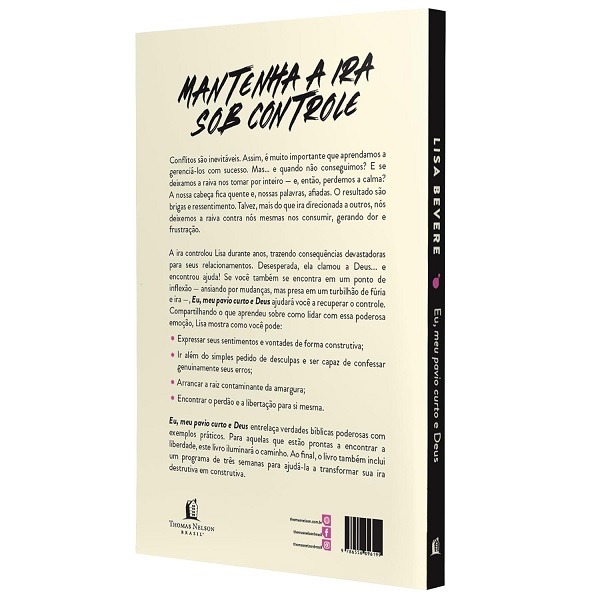 Eu, meu pavio curto e Deus entrelaça verdades bíblicas poderosas com exemplos práticos para mulheres cristãs que estão prontas para encontrar a honestidade e a liberdade. O livro também inclui um programa de três semanas para ajudá-la a lidar com a sua ira de maneira construtiva, promovendo assim o crescimento espiritual.
