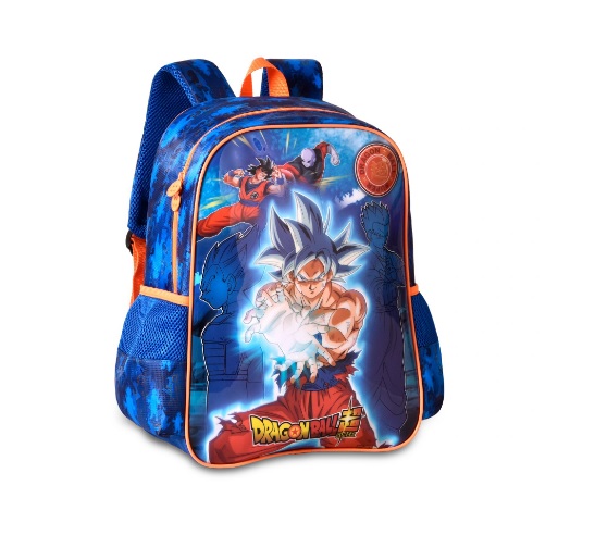 A mochila oficial do Dragon Ball Super é confeccionada em poliéster 420D com frente em PVC. Acompanha puxadores personalizados.
