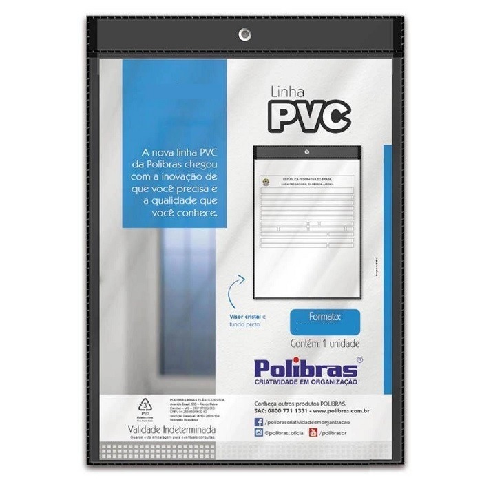 Protetor para alvará, fundo revestido por PVC preto e visor cristal. A nova linha PVC da Polibras chegou com a inovação de que você precisa e a qualidade que você merece. Ideal para armazenar folhas e documentos do tamanho ½ oficio ou menor.